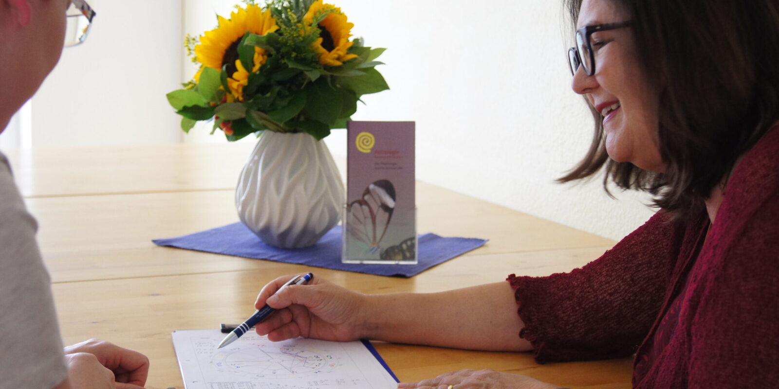 Gemeinsam erörtern wir die Themen Ihrer Seele. Das Horoskop dient dabei als Schatzkarte, deren Symbolik ich erläutere. Sie wählen selbst, welche Schätze Sie bergen und welchen Weg Sie gehen wollen. Das Beratungsgespräch bildet für Ihre Entscheidung eine fundierte Grundlage.
